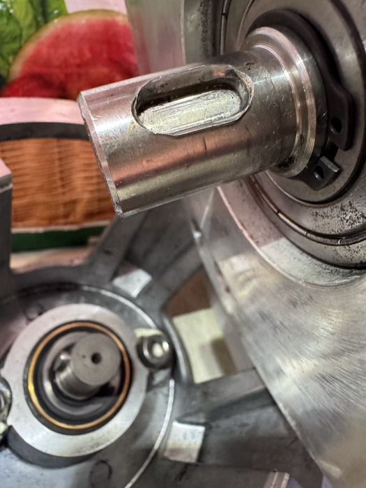 Put back both holding keys in their corresponding grooves (above it already is placed on the gearbox in the background, still missing the holding key for the motor (top).