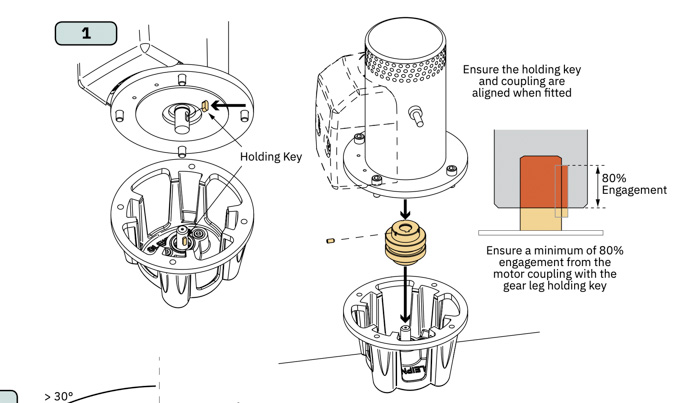 Place the rubber coupling onto the motor (I needed to bang it into place with a rubber hammer) and then align both shafts for the motor and gear carefully and place the motor on top again, securing it with the four Allen bolts.