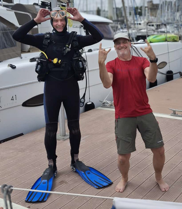 Ready for the dive to check the propellers of the bowprop. In all honesty, being just a foot under the water a snorkel would have done as well, but it was fun with a dive!